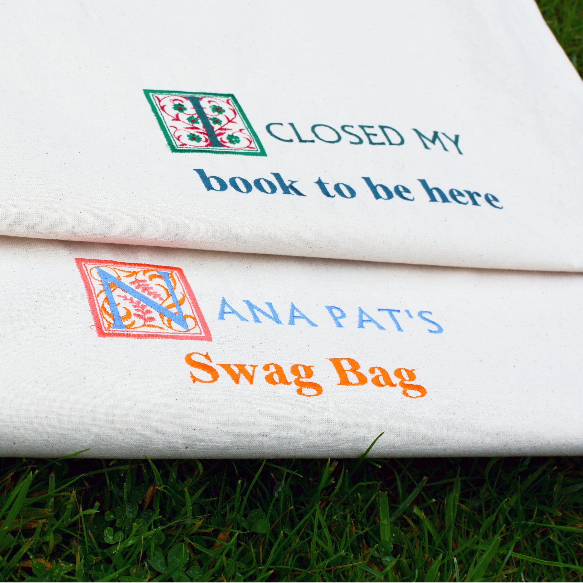 Create a custom text tote bag using an embroidered ornate monogram coupled with 2 lines of your text.