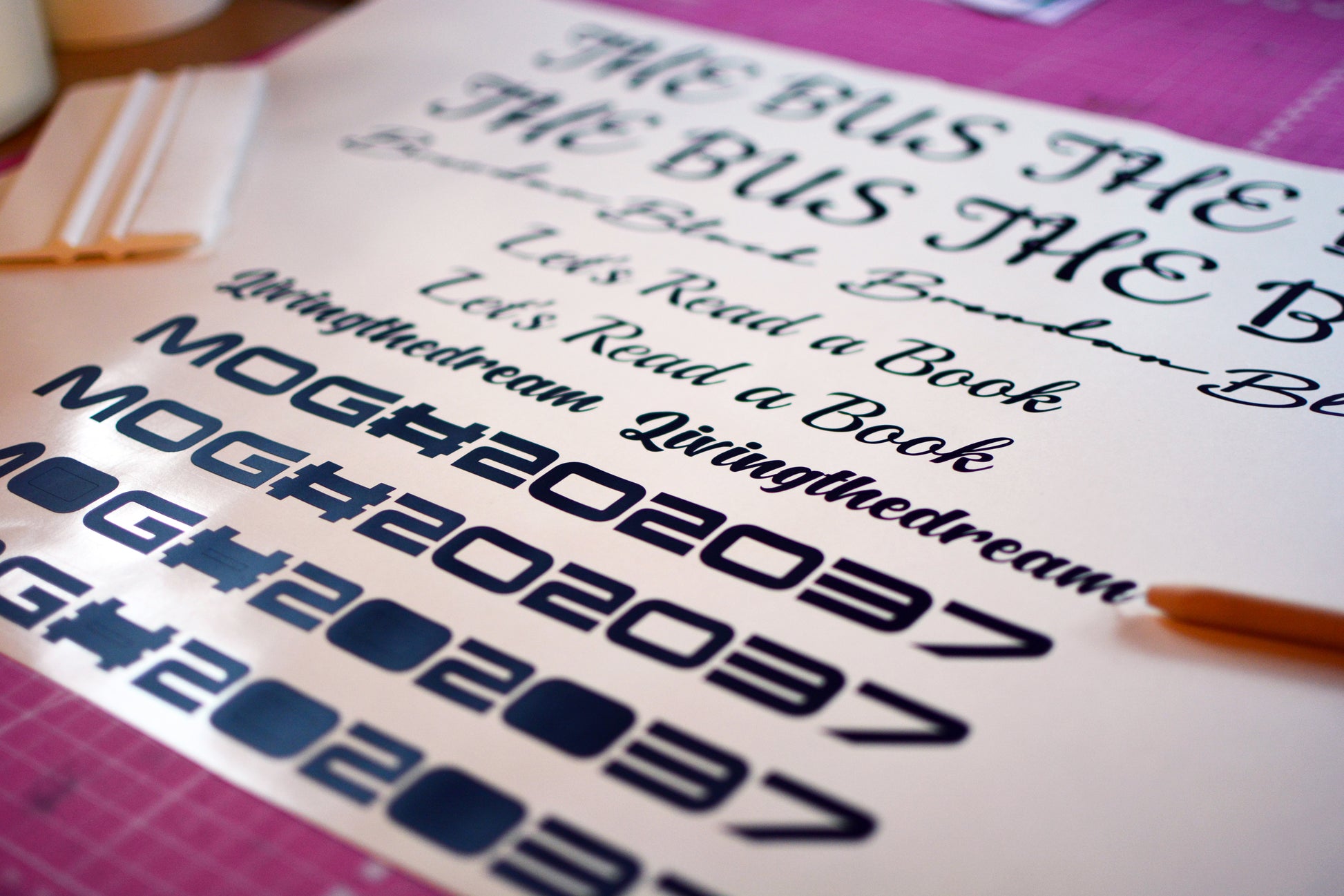 Create a custom text vinyl decal sticker by selecting from over 200 font styles, 20 vinyl colours, and sizes up to 1.25m. 2 Identical stickers are included per order.